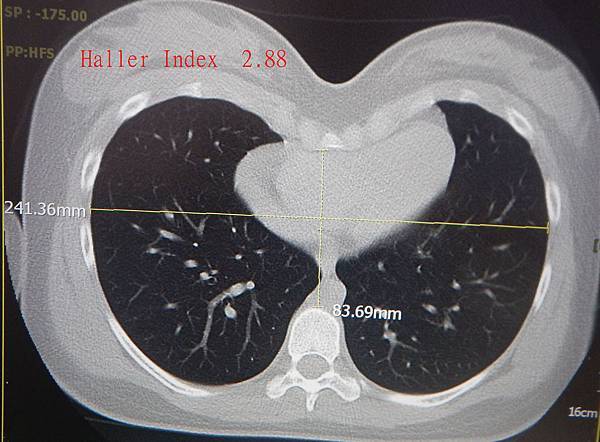 以現在的觀點看來, 這種方式雖然方便, 但過於粗率, 甚至被認為是手術矯治的標準, 就不合適了. 目前儀器檢查的進步, 以心臟超音波, 心電圖, 電腦斷層, X-光, 及肺功能等等, 即可更精確評估心肺功能的影響, 而且有時, 如下圖, 明顯心臟被壓迫變形, 應儘早矯治, 但Haller index卻只有2.88.