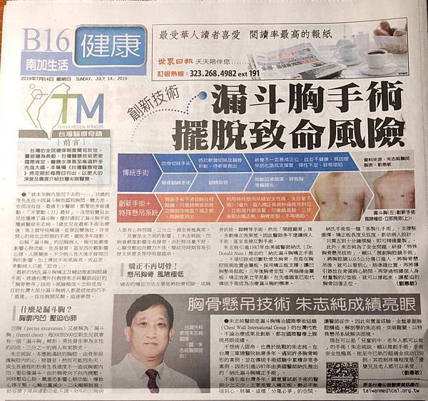 2019年7月14日美國世界日報: 朱志純醫師漏斗胸手術治療創新技術